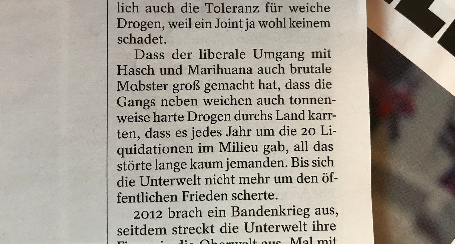 Das mag so alles stimmen, journalistisch ist es allerdings nicht überzeugend vorgetragen. Nahe am Niveau des Boulevards schreibt das Leitmedium hier frei heraus über Dinge, die nirgends im Text belegt sind. Fakten, interpretationsbedürftige Daten und reine Mutmaßungen werden munter vermengt, bis eine diffuse Gemengelage entsteht, die beim Leser wohl einfach Angst auslösen soll. Und passenderweise findet sich am Ende des Artikels ein Kasten, der das Ganze schön auf die hierzulande gerade im Zuge aktueller politischer Konstellationen sehr munter diskutierten Legalisierung von Gras zuspitzt. Ein Schelm, wer Böses dabei denkt.